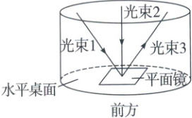 (9)[新考法]小滨在一个玻璃缸底部放一块平面镜,然后用加湿器使玻璃缸内充满水雾,用一个激光灯发出光束1射向平面镜,用另一个激光灯发出光束2当做法线(如图所示)。小滨使玻璃缸内充满水雾的目的是_;小滨围绕玻璃缸缓慢转动,从某个角度观察到_的现象时,可判断反射光线、入射光线和法线在同一平面内。