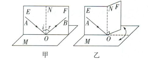 (3)如图甲,E、F在同一平面上,让入射光AO射向镜面,量角器上显示入射角和反射角的大小,可得出∠r_(选填“>”“<”或“=”)∠i。