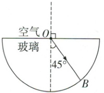 4. (2025·包河区校级二模)一束光从半圆形的玻璃斜射入空气中,在玻璃与空气的交界面上同时发生反射和折射,其中反射光线OB如图所示。请在图中画出入射光线AO和折射光线OC的大致方向,并标出入射角的大小。
