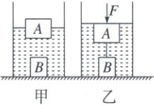 3. 水平地面有一底面积为$400cm^{2}$,装有大量水的圆柱形容器(容器壁厚度不计)。将物块$A$、$B$置于盛水容器中,物块$A$为底面积$150cm^{2}$、高$10cm$的柱体,物块$B$为边长$10cm$、重$13N$的正方体。待稳定后,$A$有$\frac{2}{5}$的体积露出水面,$B$沉底,如图甲。现对$A$物块施加竖直向下的压力$F$直至$A$刚好浸没入水中,再用轻质细绳(绳子伸长忽略不计)连接$A$、$B$,绳子恰好拉直,如图乙。再缓慢减小压力$F$,直至$B$刚好离开容器底部。求:($g = 10N/kg$)
