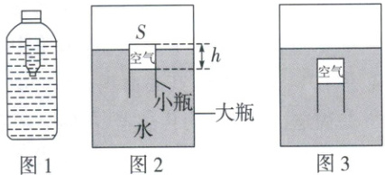 (1)图2中A所受浮力$F_{浮}=mg$。(2)图2中A排开水的体积$V_{排}=\frac{m}{\rho_{水}}$。(3)图2和图3中小瓶内空气的密度之比$\frac{\rho_{2}}{\rho_{3}}=\frac{m}{\rho_{水}Sh}$。