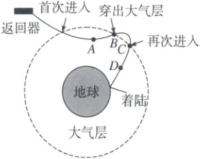 5. 嫦娥五号返回器用类似“打水漂”(钱学森弹道)的方式着陆地球;其着陆过程的部分轨迹简化如图所示,其中$B$、$C$两点高度相同,$AB$段返回器的动能_;$BC$段返回器的机械能_;$CD$段返回器的动能增加量_重力势能的减少量,以上三空正确的是(