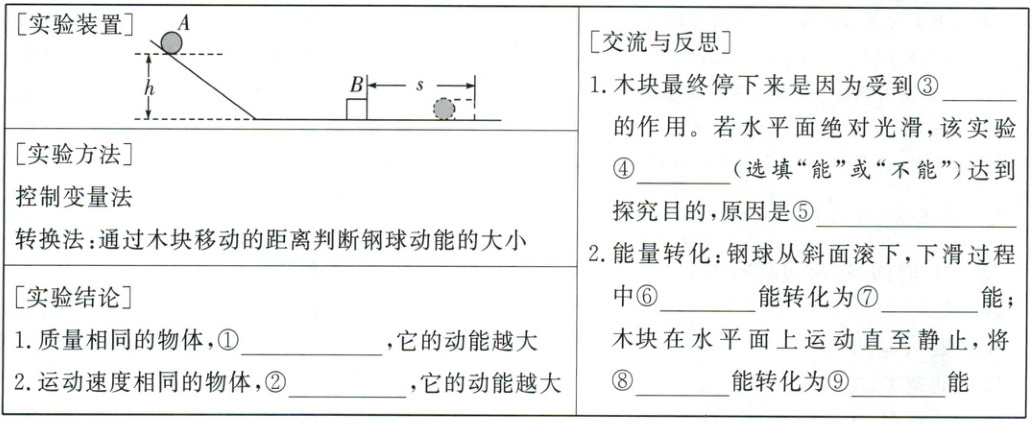 实验 ①运动的速度越大 ②质量越大 ③阻力 ④不能