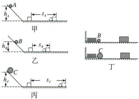 针对练习:为了模拟研究超载和超速带来的安全隐患,小明同学设计了如图所示的探究实验:将$A$、$B$、$C$三个小球从同一装置高度分别为$h_{A}$、$h_{B}$、$h_{C}$的位置由静止滚下($m_{A} = m_{B} < m_{C}$,$h_{A} = h_{C} > h_{B}$),推动小木块运动一段距离后停止,根据生活经验和所学的物理探究方法回答。