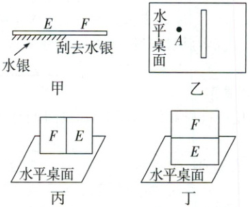 (11) [新考法]在探究平面镜成像的特点的实验中,小军用美工刀将平面镜的一部分水银刮掉(相当于玻璃板),如图甲所示,有水银的部分为 E,刮去水银的部分为 F。将白纸平铺在水平桌面上,镜面与桌面垂直放置,图乙是实验过程中的俯视图,其中点 A 表示蜡烛 A 的位置,人眼在蜡烛 A 一侧适当的位置观察实验现象。为了便于坐在镜面两侧的同学观察实验现象,且更有利于实验探究,应按照_______(选填“图丙”或“图丁”)的方式放置。