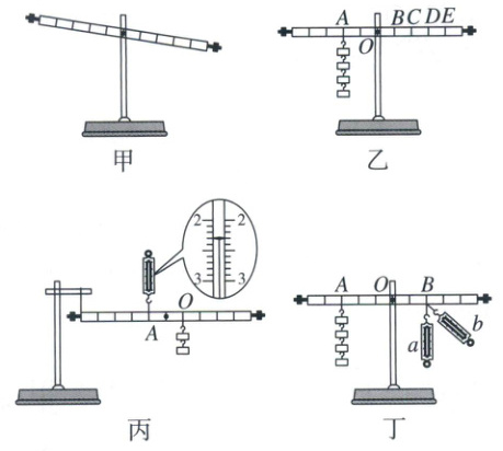 (5) 如图丁所示,在$B$点用弹簧测力计向下拉杠杆,使杠杆在水平位置平衡,当测力计从$a$位置转动到$b$位置时,杠杆始终水平平衡,其示数将______(选填“变大”“变小”或“不变”),原因是______。