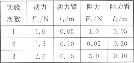 (2)由表格数据可得,第一次实验中有$1.0N×0.05m=1.0N×0.05m$,第二次实验中有$1.5N×0.10m=0.05N×0.30m$,第三次实验中有$2.0N×0.15m=3.0N×0.10m$,由此可知,杠杆平衡条件的表达式为$F_1l_1=F_2l_2$。