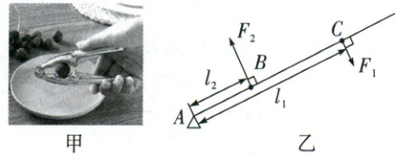 3. (2024·安徽)如图甲所示,用核桃钳夹核桃时,用力握紧手柄即可夹碎核桃。将上部的手柄$ABC$简化为如图乙所示的杠杆,若$F_{1}=20\ N$,$l_{1}=10\ cm$,$l_{2}=4\ cm$,忽略杠杆自身的重力,则$F_{2}$的大小为