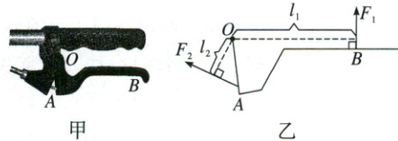 2. (2025·安徽)图甲所示为自行车的手闸,将其$OAB$部分简化为如图乙所示的杠杆,忽略杠杆自身的重力,当杠杆平衡时,施加在$B$点的动力$F_{1}=15\ N$,测得$l_{1}=12\ cm$,$l_{2}=4\ cm$,则阻力$F_{2}=$