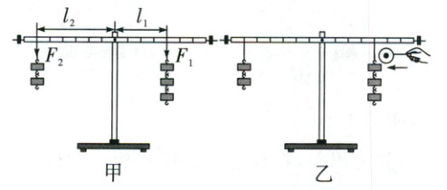 (2) 第$3$次实验后,用带杆的滑轮水平向左缓慢推动右边挂钩码的悬线(保持上端悬点不动),如图乙所示,不计摩擦,杠杆