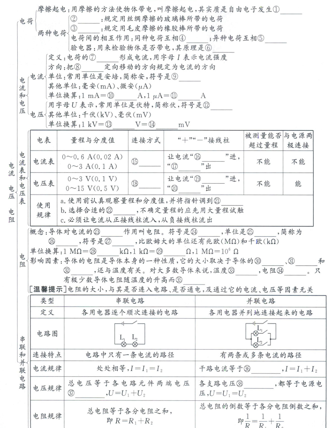 ①转移 ②正电荷 ③负电荷 ④排斥 ⑤吸引 ⑥同种电荷相互排斥 ⑦定向移动 ⑧正电荷 ⑨A ⑩10⁻³ ⑪10⁻⁶ ⑫V ⑬10³ ⑭10⁶ ⑮串联 ⑯+ ⑰- ⑱并联 ⑲+ ⑳- ㉑零刻度线 ㉒量程 ㉓阻碍 ㉔R ㉕欧姆 ㉖欧 ㉗Ω ㉘10³ ㉙10³ ㉚材料 ㉛长度 ㉜横截面积 ㉝越高 ㉞越大 ㉟减小 ㊱各支路电流之和 ㊲之和 ㊳相等