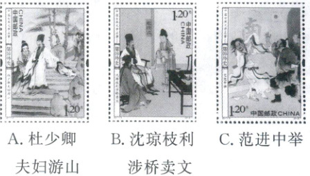 (3)小明同学收集到三枚《儒林外史》邮票(如下图),按照小说情节的先后顺序,三枚邮票应排序为____、____、____(填写字母)。