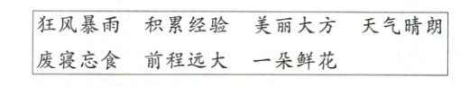 5.C [解析]A.动宾短语:积累经验。B.主谓短语:天气晴朗、前程远大。C.并列短语:狂风暴雨、美丽大方、废寝忘食。D.偏正短语:一朵鲜花。