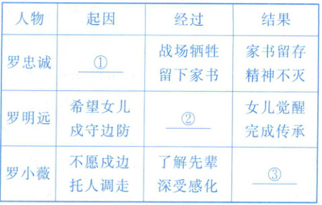 [解析]本题考查内容概括。①:根据第四段“1950年冬,17岁的罗忠诚雄赳赳气昂昂跨过鸭绿江”可知,罗忠诚跨过鸭绿江是为了抗美援朝,保家卫国,因此①处应填“抗美援朝,奔赴战场”。②:根据第三段“我带你去见见我的三叔”和第十四段展示巡逻日志可知,罗明远希望女儿戍守边防,并采取了走近先辈来教育女儿的措施,因此②处应填“教育女儿走近先辈”。③:根据第十六段捐献军功章等情节和最后第一段中“小薇在桌前写完入党申请书,在‘我自愿长期戍守边防’”可知,女儿思想的转变。女儿刚开始不愿戍边,并且请求父亲找人将自己调走,在了解先辈后深受感化,最终写入党申请书决定长期戍守边防,因此③处应填“申请入党自愿戍边”。