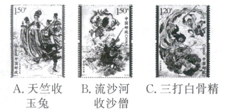 (2)小伟同学收藏有三枚《西游记》邮票(如下图),其中与选文内容相关的一枚邮票是________(填写字母);按照小说故事情节的先后顺序,三枚邮票应排序为________、________、________(填写字母)。(4分)