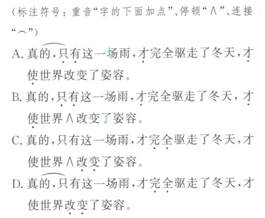 4.A [解析]A.“真的”与后句连读能够快速衔接情感,营造出强烈的强调、感慨语气,引出后文对这场雨重要意义的阐述;重读“只有”“才”“才使”这些关联词,突出这场雨在驱走冬天、改变世界姿容中的唯一性与关键性,强调正是这场雨带来了从冬到春的巨大转变,处理正确;B.重音“只有”“才”“才使”的判断是正确的,但在停连处理上存在问题。“才使世界∧改变了姿容”这里的停顿破坏了句子的连贯性,使得“才使世界”与“改变了姿容”之间的逻辑联系被不恰当地切断,影响了句子语义的完整表达,错误;C.重音设置为“完全”“改变”不太恰当。“完全”在这里并不是句子语义表达的核心强调点,相比之下,原句更侧重于表达这场雨的唯一性以及对驱走冬天和改变世界姿容的决定性作用,所以“只有”“才”“才使”作为重音更能体现句子的本意。“才使世界∧改变了姿容”这里的停顿破坏了句子的连贯性,错误;D.重音设置为“完全”“改变”是不准确的,这种设置无法突出句子中这场雨的特殊意义以及它与驱走冬天、改变世界姿容之间的必然联系,错误。