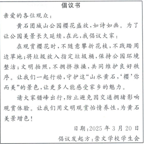 1. 黄石团城山公园樱花盛放之际,小黄计划写一份倡议书,请你帮忙完成。