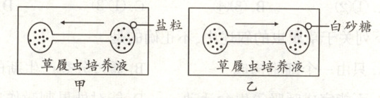 (4) 兴趣小组的同学在两个载玻片的两侧各滴一滴草履虫培养液,然后用牙签将两滴培养液连通起来。在图甲中右侧的培养液里放盐粒,在图乙中右侧的培养液里放等量的白砂糖,观察草履虫的反应(如图所示,箭头方向为草履虫的移动方向),实验结果说明