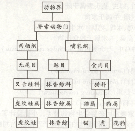(2)猫与虎、花豹有相同的分类等级,其从大到小依次是界、门、纲、目、