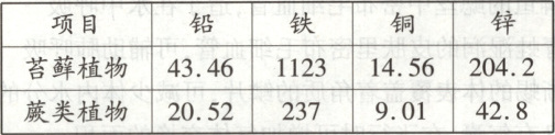 14. 实验小组同学比较同一生活环境中苔藓植物与蕨类植物重金属含量(mg/kg),测得的数值如表。下列相关分析正确的是 (
