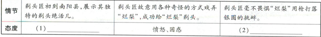 [解题思路]本题考查考生对人物情感的把握。首先,结合题干分析表格内容,明确作答方向。分析可知,表格上半部分概括了具体情节(故事中剃头匠的具体行为),下半部分则是保安团长“烂梨”对剃头匠的对应态度(考生需填写情节一、三对应的保安团长“烂梨”的态度)。然后结合所给内容,明确作答区间,进而概括。“剃头匠初到南阳县,展示其独特的剃头绝活儿”对应第⑤段,根据下文“烂梨”听闻消息立马前去找剃头匠的行为,可看出其态度是“好奇、期待”[第