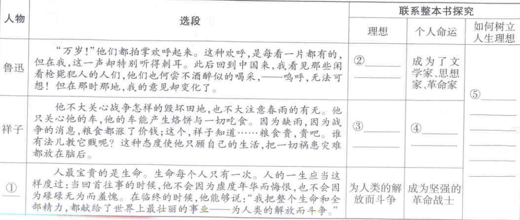 3 ①保尔·柯察金(保尔) ②通过文学唤醒国民精神 ③拥有一辆属于自己的车,过上安稳的生活 ④经历“三起三落”,最终堕落成麻木的行尸走肉 ⑤示例:树立理想应与时代需求相结合;理想需要坚定的信念支撑(6分。前4空每空1分,第5空2分)
