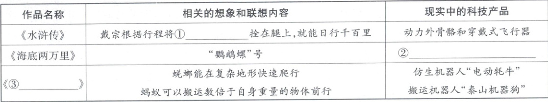 7. 文学作品中充满了探索想象的成分,很多的艺术想象和联想都变成了现实中的科技产品。请根据表格中的提示填空。(3 分)