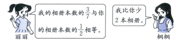 4.分析:根据“丽丽的相册本数的$\frac{3}{7}$与桐桐的相册本数的$\frac{1}{2}$相等”可知,桐桐的相册本数是丽丽相册本数的$\frac{3}{7}÷\frac{1}{2}=\frac{6}{7},$那么两人相差的2本对应的分率是$(1-\frac{6}{7}),$由此可先求出丽丽的相册本数,再求出桐桐的相册本数。
