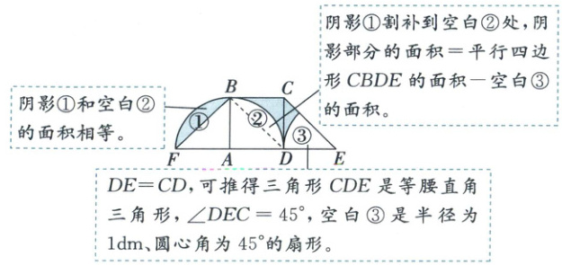 空白③为半径1dm、圆心角45°的扇形,面积:3.14×1²×(45/360)=0.3925(dm²)