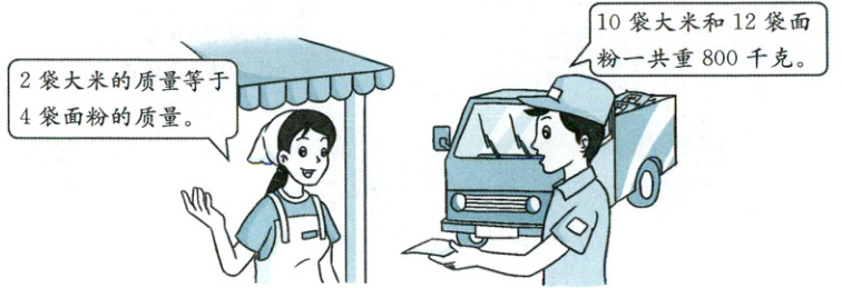 答:1 袋大米重 50 千克,1 袋面粉重 25 千克。