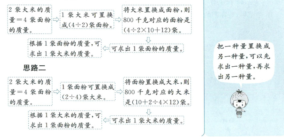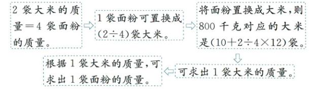 1 袋面粉的质量:2÷4×50 = 25(千克)或(800 - 50×10)÷12 = 25(千克)