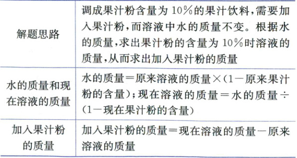 典型例题 一杯300克的果汁饮料中,果汁粉的含量为7%。现在将它调成果汁粉含量为10%的果汁饮料。还需加入多少克果汁粉?
