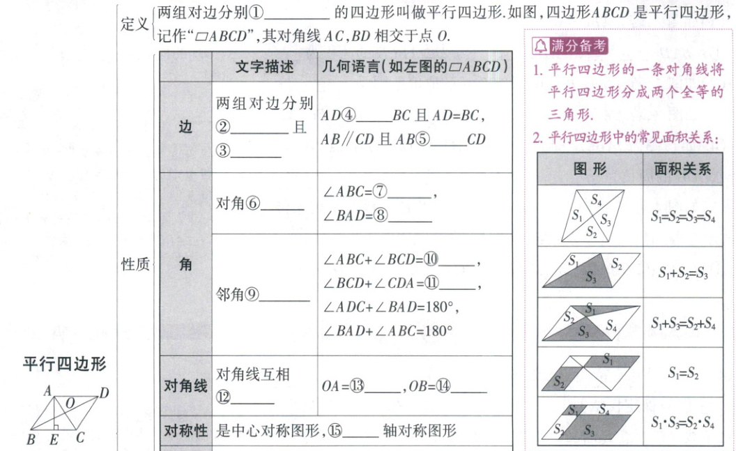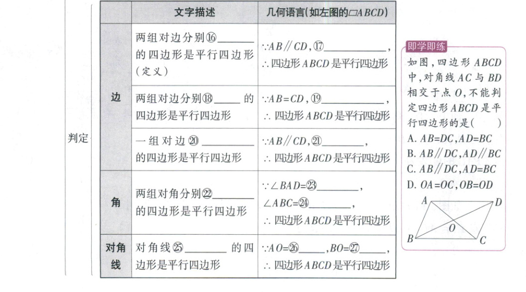 1平行 2平行 3相等 4// 5= 6相等 7∠ADC 8∠BCD 9互补 10180° 11180° 12平分 13OC 14OD 15不是 16平行 17AD//BC 18相等 19AD=BC 20平行且相等 21AB=CD 22相等 23∠BCD 24∠ADC 25互相平分 26CO 27DO