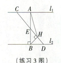 如图,已知两条平行线 $ l_1 $,$ l_2 $,$ A $ 是 $ l_1 $ 上的定点,$ AB \perp l_2 $ 于点 $ B $,$ C $,$ D $ 分别是 $ l_1 $,$ l_2 $ 上的动点,且满足 $ AC = BD $,连接 $ CD $ 交线段 $ AB $ 于点 $ E $,$ BH \perp CD $ 于点 $ H $。则 $ AB $,$ BE $ 的数量关系为_;当 $ \angle BAH $ 最大时,$ \sin \angle BAH $ 的值为_。