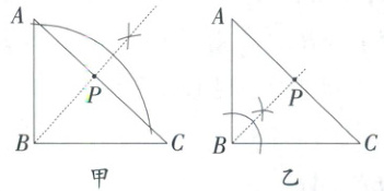 练习二 [25·邯郸名校模考] 已知在$\triangle ABC$中,$AC>BC>AB$,$\angle C = 45^{\circ}$,用尺规在边$AC$上求作一点$P$,使$\angle PBC = 45^{\circ}$.如图是甲、乙两位同学的作图,下列判断正确的是 ()