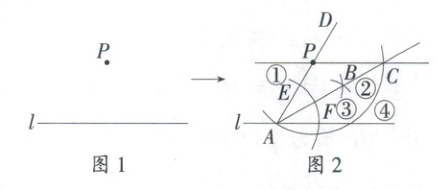 练习三 如图 1,使用尺规经过直线$l$外的点$P$作已知直线$l$的平行线,作图痕迹如图 2,下列关于图中的四条弧线(①②③④)的半径长度的说法中,正确的是 ()