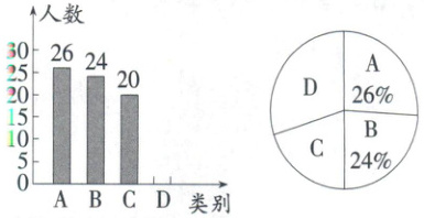 (1)问卷调查的总人数为26÷26%=100(人),D类别人数为100−(26+24+20)=30(人),补全条形图如图: