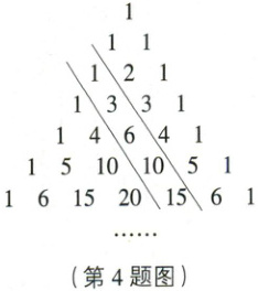 4. 数学文化 如图,被称为“杨辉三角”或“贾宪三角”。其规律是:从第三行起,每行两端的数都是“1”,其余各数都等于该数“两肩”上的数之和。表中两平行线之间的一列数:1,3,6,10,15,$·s$,我们把第一个数记为$a_{1}$,第二个数记为$a_{2}$,第三个数记为$a_{3}$,$·s$,第$n$个数记为$a_{n}$,则$a_{4} + a_{200}$ =()