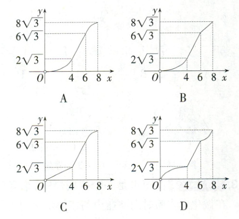 4. [25·齐齐哈尔]如图,在菱形ABCD中,$\angle$A = $60^{\circ}$,AB = 4,动点E从点A出发沿边AB→BC匀速运动,运动到点C时停止,过点E作AD的垂线l,在点E运动过程中,垂线l扫过菱形(即阴影部分)的面积为y,点E运动的路程为x(x > 0).下列图象能反映y与x之间函数关系的是()