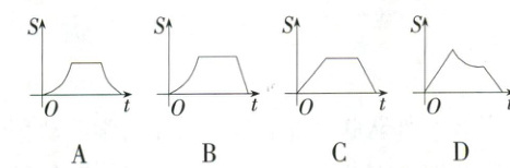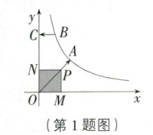 1. [25·衡水模拟]如图,已知点A是直线y = x与反比例函数y = $\frac{k}{x}$(k > 0,x > 0)的交点,B是y = $\frac{k}{x}$图象上的另一点,BC $//$ x轴,交y轴于点C.动点P从坐标原点O出发,沿O→A→B→C(图中“→”表示路线)匀速运动,终点为C,过点P作PM $\perp$ x轴,PN $\perp$ y轴,垂足分别为M,N.设四边形OMPN的面积为S,点P运动时间为t,则S关于t的函数图象大致为()