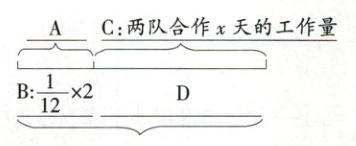 [25·邯郸名校模考]一道条件缺失的问题情境:一项工程,甲队单独做需要12天完成……还需要几天完成任务.根据标准答案,老师在黑板上画出线段示意图(如图),设两队合作还需$x$天完成任务,并列方程为$\frac{1}{12}×2 + (\frac{1}{8}+\frac{1}{12})x = 1$.根据上面信息,下面结论不正确的是()