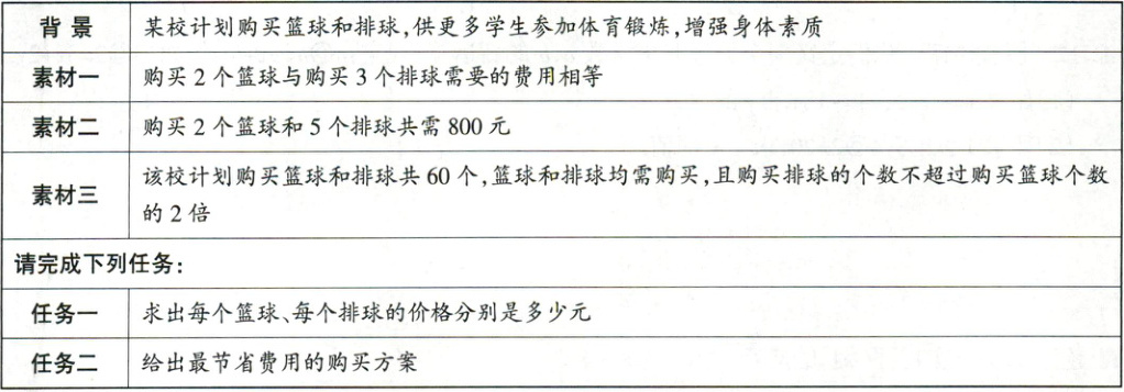 衍生三 解:任务一:设每个篮球的价格是x元,每个排球的价格是y元,
