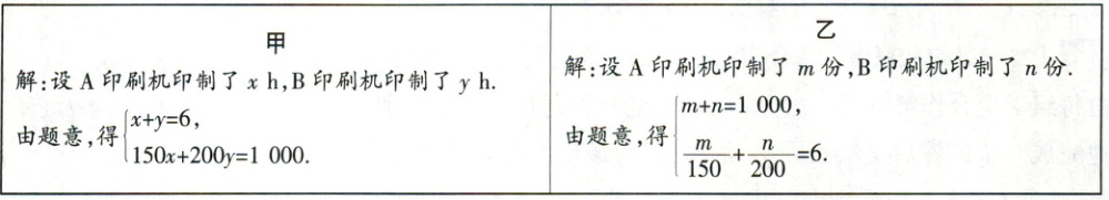 印刷机先后接力完成.已知$A$印刷机印制150份/h,$B$印刷机印制200份/h,两台印刷机完成该任务共需6h.甲、乙两人所列的方程组如下所示,下列判断正确的是()