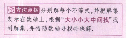 分别解每个不等式,并把解集表示在数轴上,根据“大小小大中间找”找到解集,并借助数轴寻找特殊解.