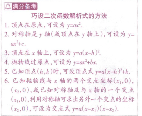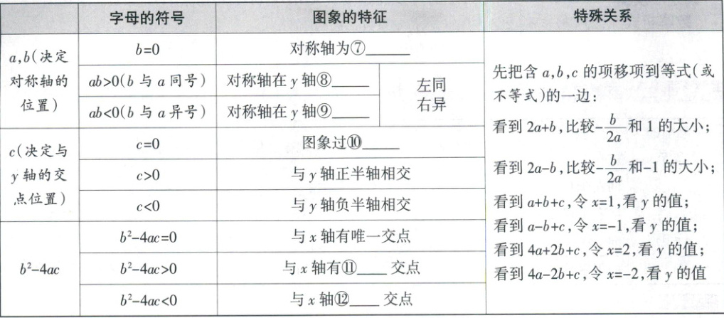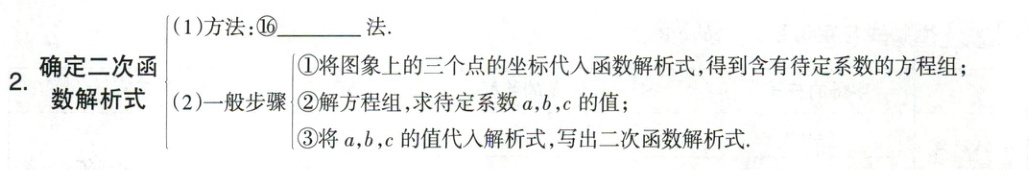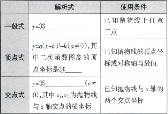 ⑬$ax^{2}+bx + c(a\neq0)$ ⑭$(h,k)$ ⑮$a(x - x_{1})(x - x_{2})$ ⑯待定系数