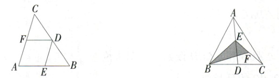 练习三 如上右图,在$\triangle ABC$中,$D,E,F$分别为$BC,AD,CE$的中点,且$S_{\triangle ABC} =$$4cm^{2}$,则图中阴影部分的面积为___$cm^{2}$.