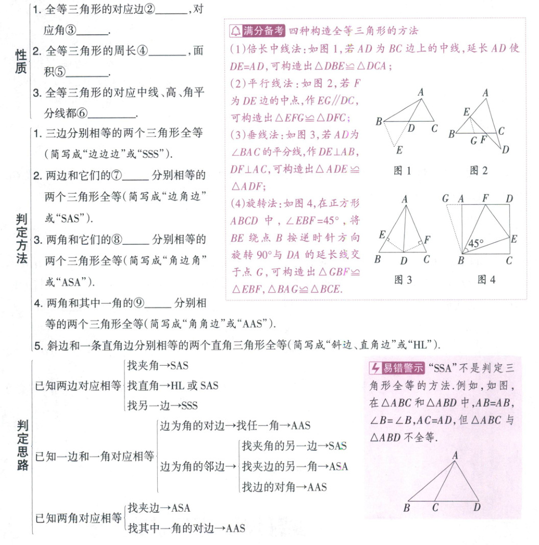 ②相等 ③相等 ④相等 ⑤相等 ⑥相等 ⑦夹角 ⑧夹边 ⑨对边