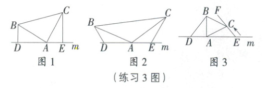 练习三 已知在△ABC中,AB=AC,D,A,E三点都在直线m上,且DE=9cm,∠BDA=∠AEC=∠BAC.