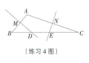 练习四 如图,已知在△ABC 中,AB 的垂直平分线交 BC 于点 D,AC 的垂直平分线交 BC 于点 E,垂足分别为 M,N,若 BD=$\frac{3}{2}$,DE=2,EC=$\frac{5}{2}$,则 AC 的长为 。