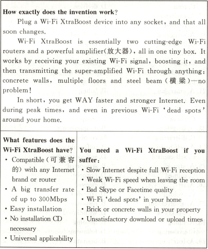 36.C 细节理解题。题干意为:Wi-Fi XtraBoost是什么?根据表格第一行中“It works by receiving your existing Wi-Fi signal,boosting it,and then transmitting the super-amplified Wi-Fi through anything”可知,Wi-Fi XtraBoost的工作原理是接收现有的Wi-Fi信号,增强信号强度,然后将经过超级放大的Wi-Fi信号穿透任何障碍物进行传输。由此可知,Wi-Fi XtraBoost是一个可以增强现有Wi-Fi信号的装置。故选C。